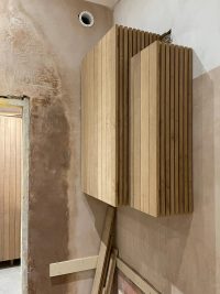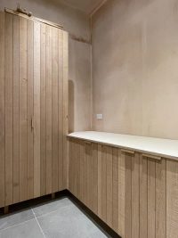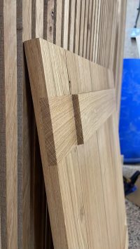 Crafted from locally sourced Oak, the saw-textured doors are constructed with a sliding dovetail rail on the rear to allow for natural movement of the timber.